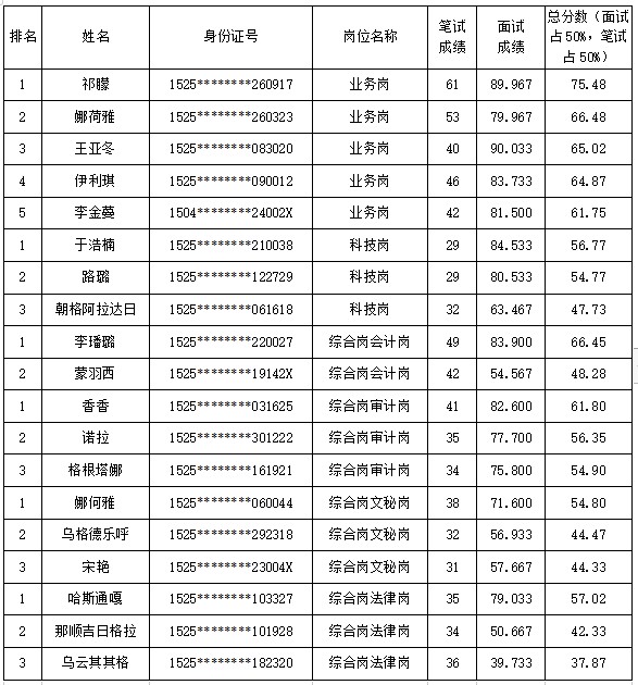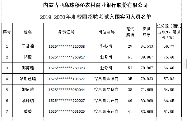 根據(jù)內(nèi)蒙古自治區(qū)農(nóng)村信用社聯(lián)合社內(nèi)農(nóng)信發(fā)〔2019〕765號文件精神要求,結(jié)合內(nèi)蒙古西烏珠穆沁農(nóng)村商業(yè)銀行股份有限公司實際招聘計劃,根據(jù)考生參加兩輪考試的筆試成績和面試成績,按照筆試與面試5 :5 的比例加權(quán)計算總成績(考試總成績=筆試成績×50%+面試成績×50%),按照招聘崗位1:1的比例由高到低確定入圍實習(xí)人員,現(xiàn)將內(nèi)蒙古西烏珠穆沁農(nóng)村商業(yè)銀行股份有限公司2019-2020年應(yīng)屆高校畢業(yè)生校園招聘考試實習(xí)入圍人員名單進(jìn)行公示,公示時間為5個工作日,自2019年12月11日至2019年12月17日。請登錄內(nèi)蒙古才路人力資源服務(wù)有限公司官網(wǎng)(http://www.clqygl.com/)查看。咨詢電話:0471-3307904。
