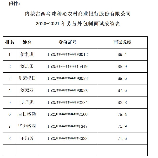 內(nèi)蒙古西烏珠穆沁農(nóng)村商業(yè)銀行股份有限公司委托內(nèi)蒙古才路人力資源服務(wù)有限公司,組織完成了內(nèi)蒙古西烏珠穆沁農(nóng)村商業(yè)銀行股份有限公司2020-2021年勞務(wù)外包制招聘考試面試考務(wù)工作?,F(xiàn)將內(nèi)蒙古西烏珠穆沁農(nóng)村商業(yè)銀行股份有限公司2020-2021年勞務(wù)外包制招聘考試面試成績進行公示。咨詢電話:0471-3307904。