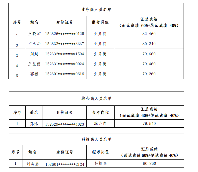 按照《察哈爾右翼后旗農(nóng)村信用聯(lián)社股份有限公司2022-2023年度應(yīng)屆高校畢業(yè)生校園招聘工作實(shí)施方案》要求,考試總成績(jī)按照面試與筆試6:4的比例加權(quán)計(jì)算,并按照招聘崗位1:1的比例確定入圍人員,現(xiàn)將入圍名單及有關(guān)事宜公示如下: