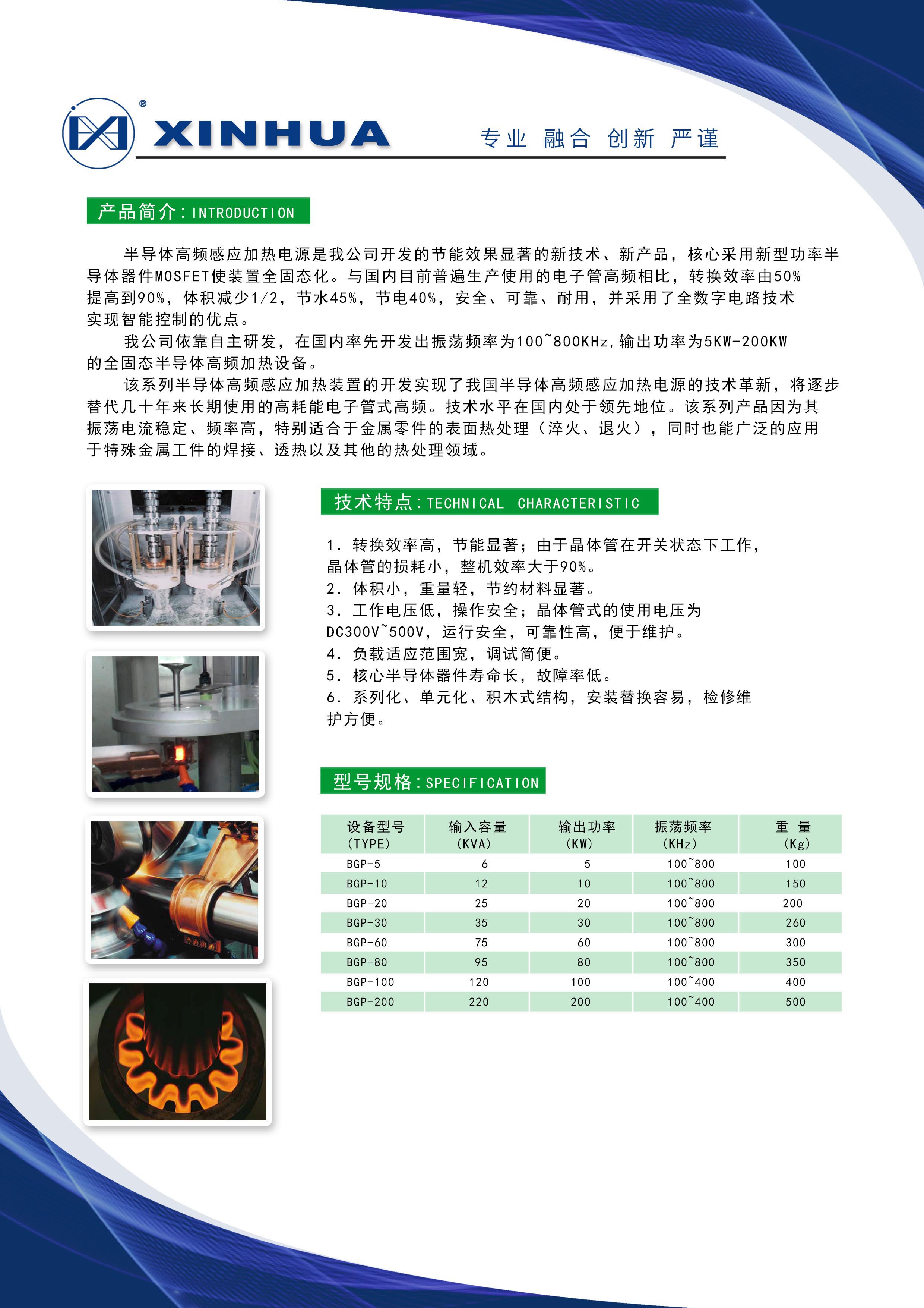 我公司依靠自主研發(fā),在國(guó)內(nèi)率先開發(fā)出振蕩頻率為100^~800KHz,輸出功率為5KW-200KW的全固態(tài)半導(dǎo)體高頻加熱設(shè)備。