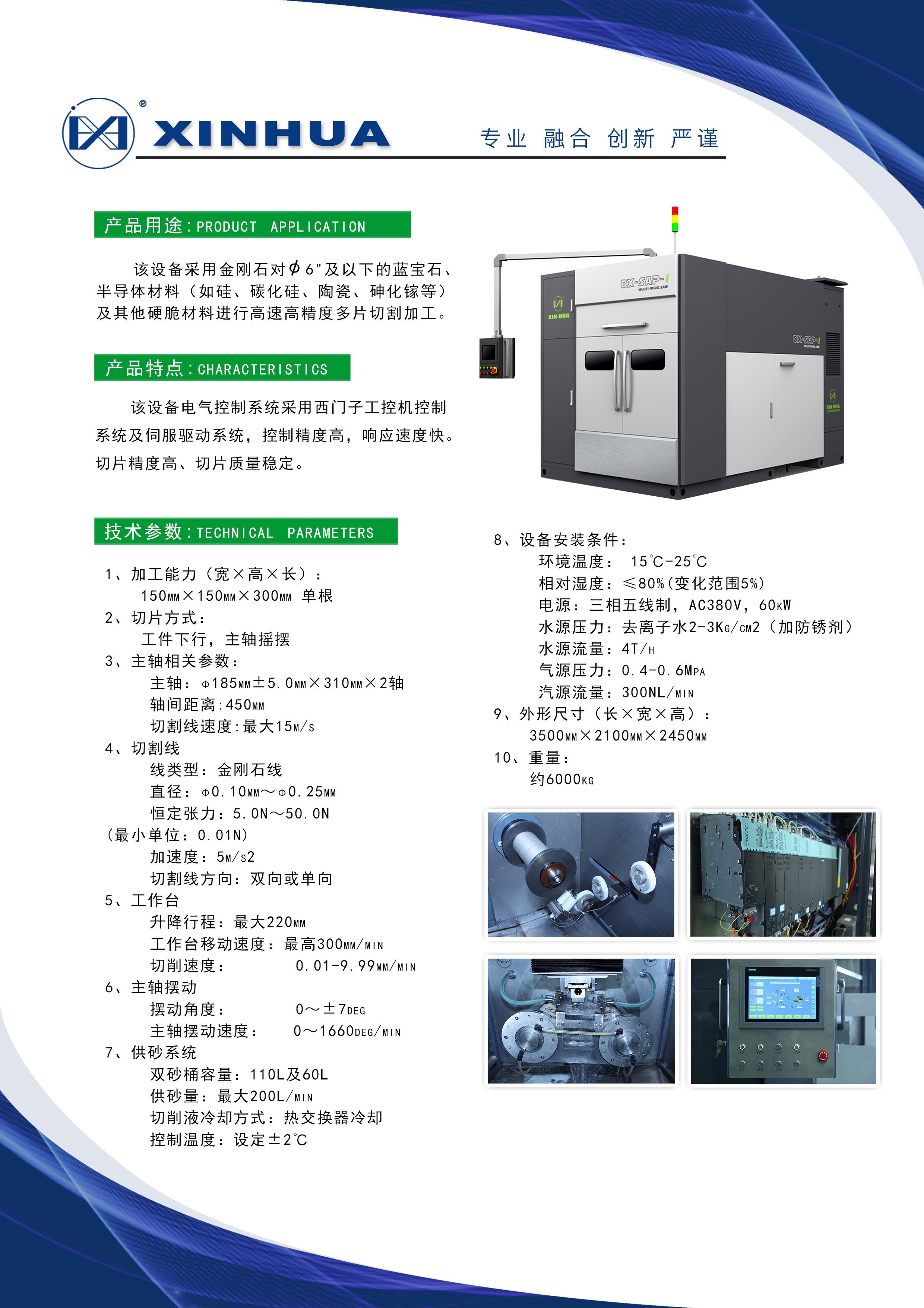該設備采用金剛石對中Φ6"及以下的藍寶石、半導體材料(如硅、碳化硅、陶瓷、砷化鎵等)及其他硬脆材料進行高速高精度多片切割加工。